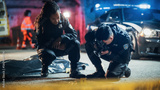 Female Black Inspector Supervising a Young Asian Man Who Newly Joined the Ranks of Police Departement in his First Crime Scene Task. Investigation Team Working on Murder Case During Night