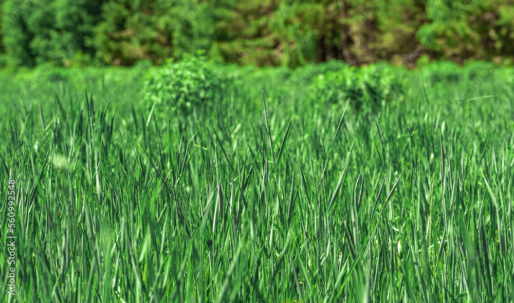 Beautiful gentle fresh green grass in the field. Green grass background or texture. Lawn with fresh grass, Banner with long green grass. Long and bright green grass texture