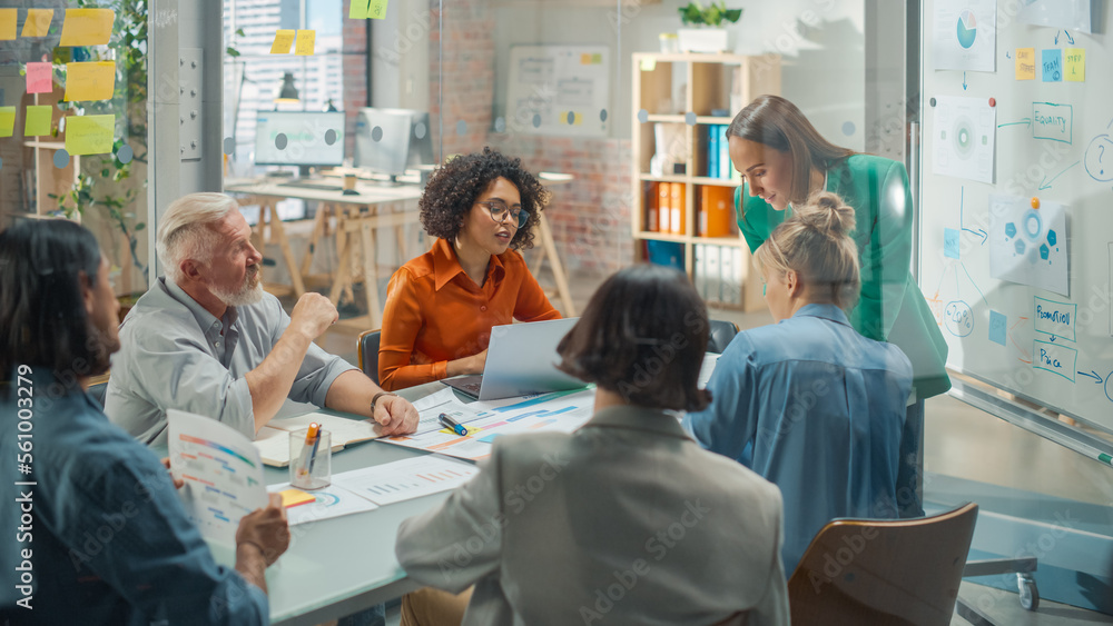 Diverse Group Adult Learners Listening to a Presentation from Female Renown Educator in Office Meeting Class Room. Business Coach Leads e-Commerce Courses, Educating Mature Students, Uses Whiteboard