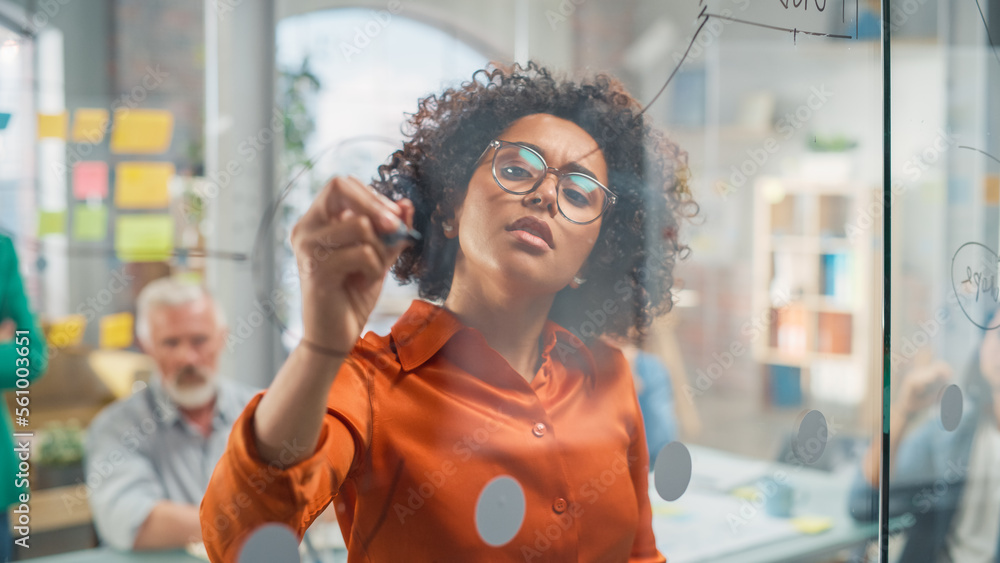 Portrait of Black Female Manager Writing on Glass Board and Brainstorming with Team in a Stylish Meeting Room in Creative Office. Team of Multi-Ethnic Professionals Focused on a Presentation
