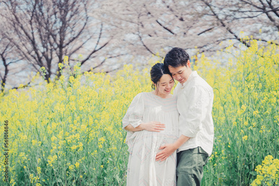 菜の花と赤ちゃんを待つ夫婦