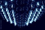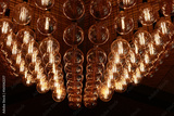 Stylish, modern and decorative lamps of Edison of round shape in the rows. Light bulbs in retro style. A lot celling glowing vintage LED lamps. Object for interior decoration, selective focus photo