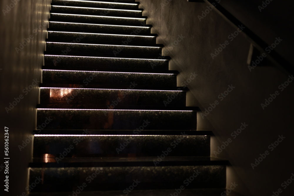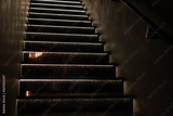 Stairwell, emergency exit in a block of flats. Indoor staircase, fire escape, against grey concrete walls up and down with natural sunlight from door upstairs.