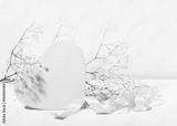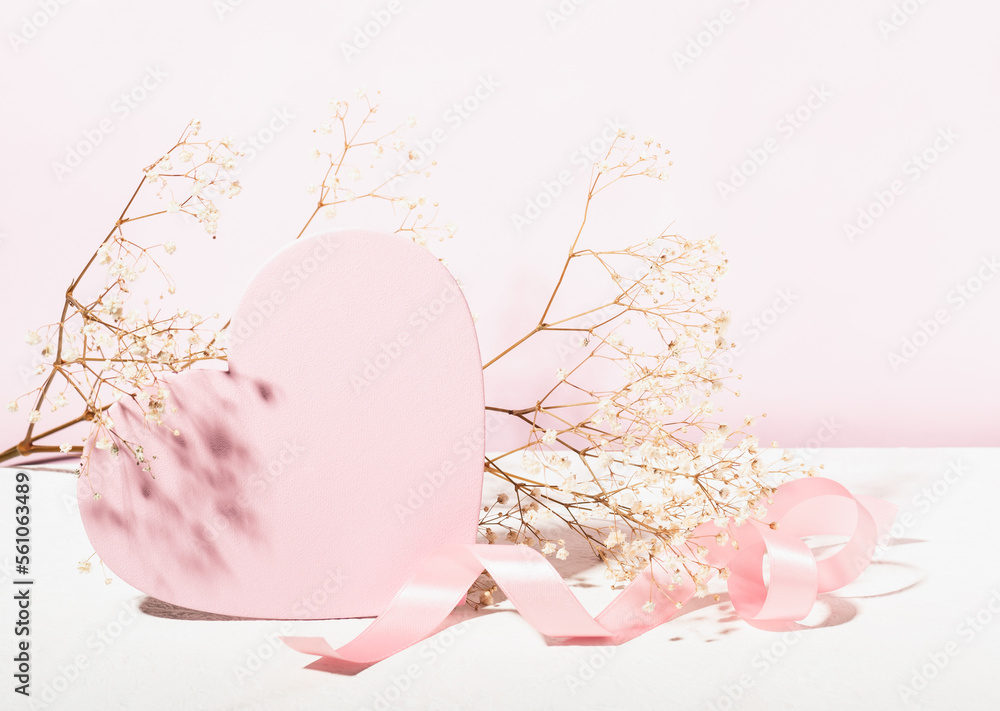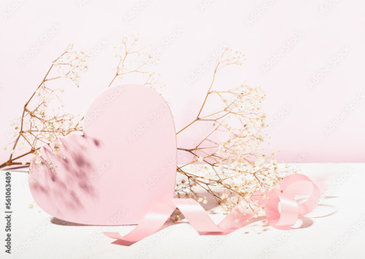 Delicate composition for Valentine's Day or Wedding Day. Pink heart on a pastel pink background, silk ribbon and gypsophila branch.