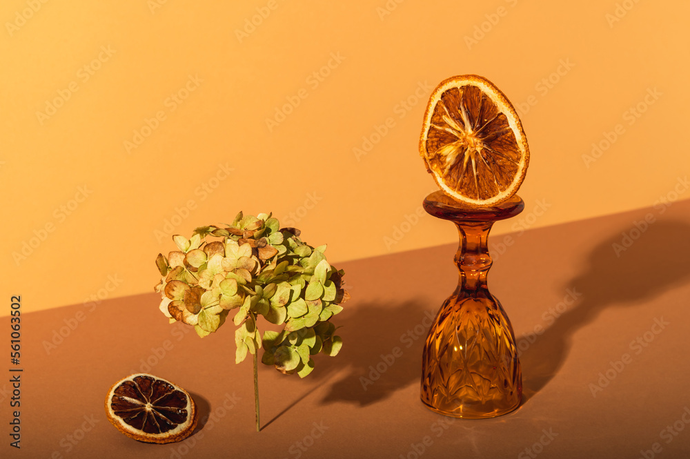 Creative composition with wine glass, dried citrus slices and hydrangea branch. Warm brown-orange background.