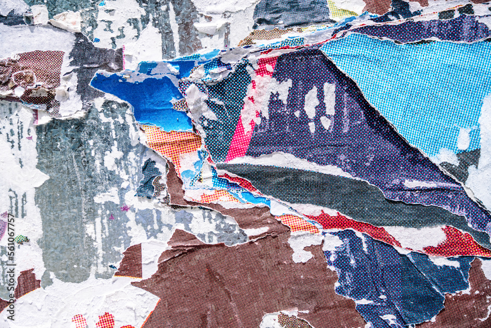 Torn paper collage background on an old poster on a street wall. Texture and surface of torn paper.
