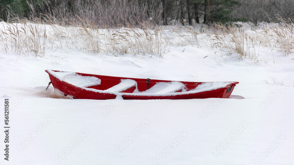 winter landscape from the seashore, red fisherman's boat on the seashore, sand and ice texture in the dunes