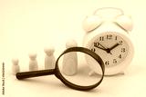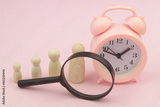 Women growing up concept. Different size woman people figures with magnifying glass and alarm clock on pink background.