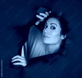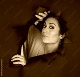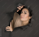 Beautiful Brunette Woman Looks Sideways Through Torn Hole