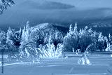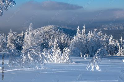 Snowy tree branches against the blue sky after a heavy snowfall in the Ural mountains