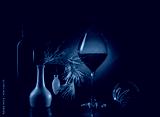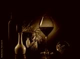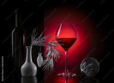 Christmas still life with a pine branch in a vase, a glass of wine and Christmas decorations on a dark background