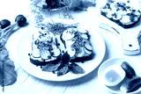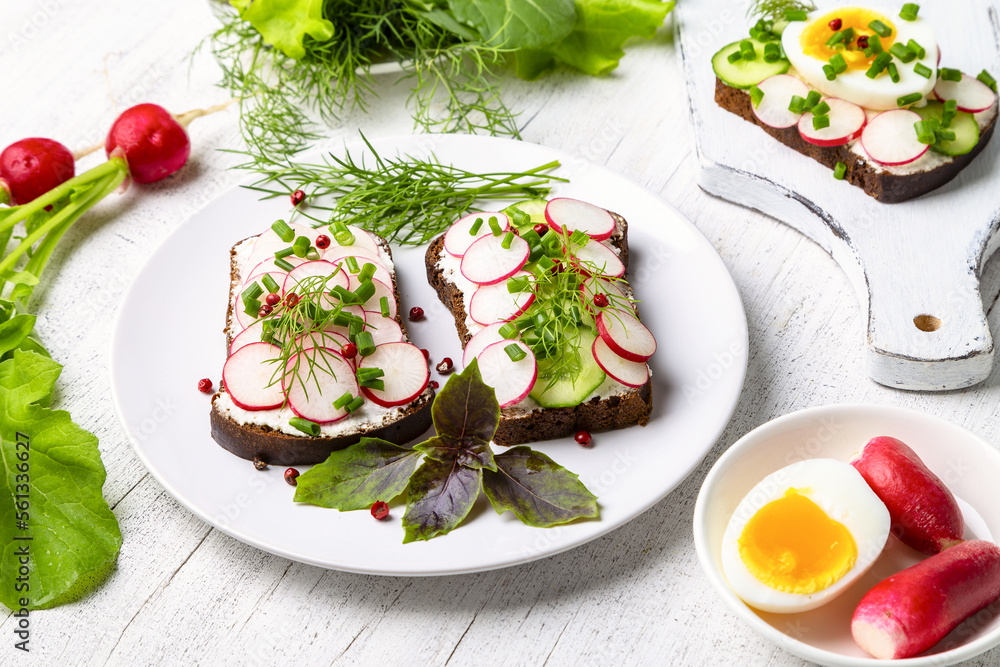 Healthy sandwiches with radish, cucumber, egg, curd cheese, sprinkled with green onions and pink pepper