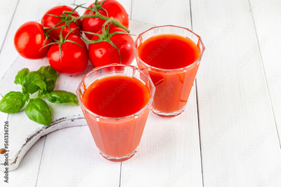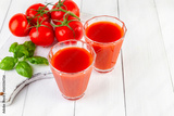 Fresh tomato juice, tomatoes and basil on a light wooden background. Copy space