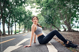 Tired asian woman sitting on the street and resting after jogging in the park surrounded by nature, Healthy lifestyle and sport concepts