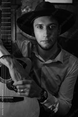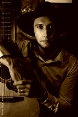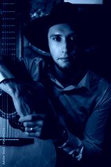 portrait of a male guitarist sitting with a guitar in the interior of a restaurant