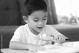 Asian Little boy reading the books on the desk with a magnifying glass.