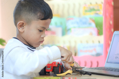 Asian boy students learn at home in coding robot cars and electronic board cables in STEM, STEAM, mathematics engineering science technology computer code in robotics for kids concept.