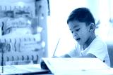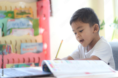 Asian schoolboy doing her homework with laptop at home. Children use gadgets to study. Education and distance learning for kids. Homeschooling during quarantine. Stay at home