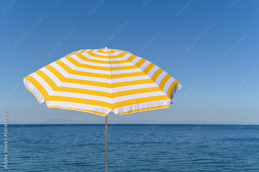 .Yellow umbrella on the top of mountain, cliff with blue sea, ocean, sky view. .