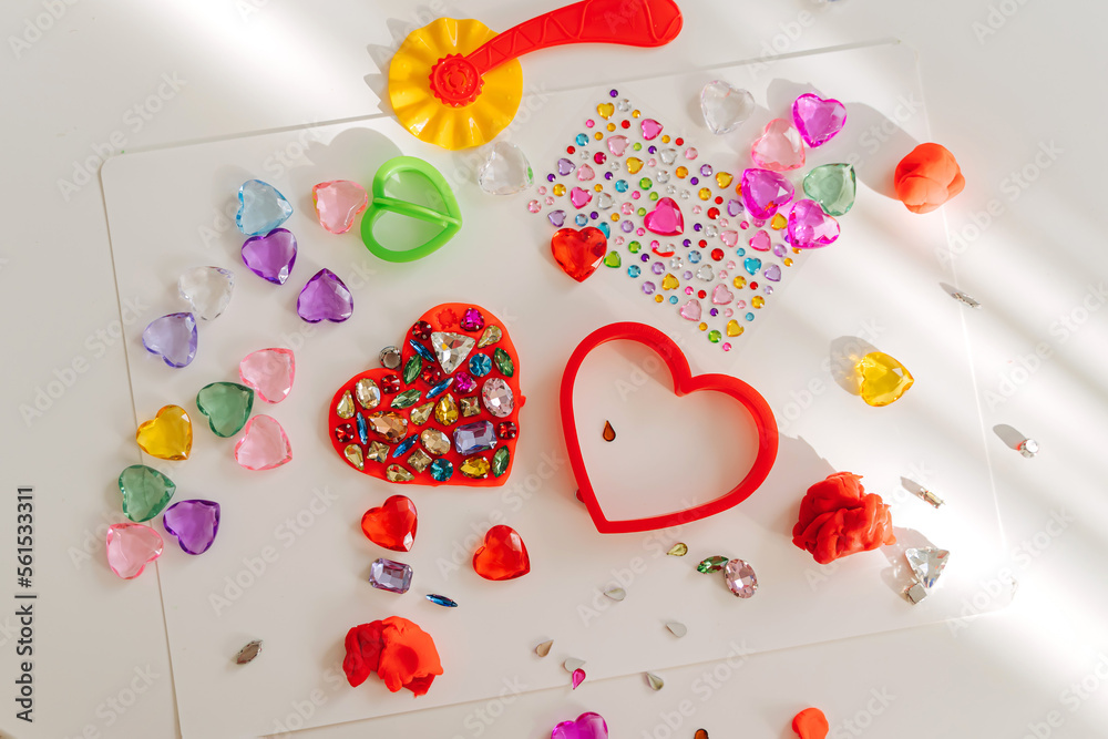 Red heart from play dough for modeling and decorations from crystal rhinestones and shiny stones on the table. Toddlers crafts for Valentine's Day. Holiday Art Activity for Kids.