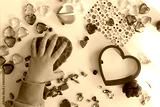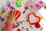Child hands creating red heart from play dough for modeling with decorate from crystal rhinestones and shiny stones. Toddlers crafts for Valentine's Day. Holiday Art Activity for Kids.