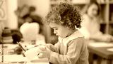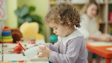 Adorable hispanic girl holding gift sitting on floor by christmas tree with unhappy expression at kindergarten