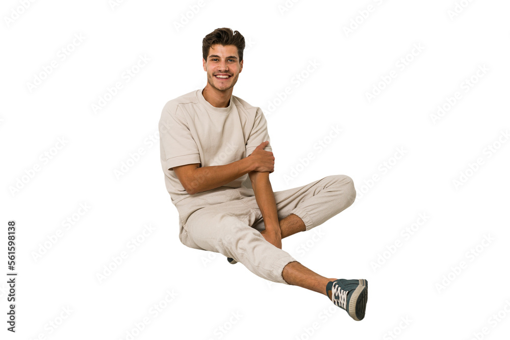 Young caucasian man sitting on the floor isolated on white background