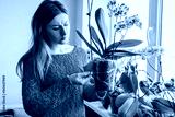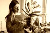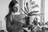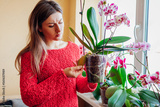 Woman checking orchid with yellow leaf. Diseased infected plant. Taking care of health of home plants and flowers.