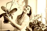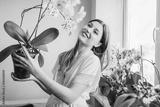 Smiling woman enjoys blooming white orchid with purple dots holding pot. Gardener takes care of home plants and flowers.