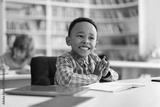 Happy african american primary school boy sitting at desk in classroom, writing in notebook and smiling, free space