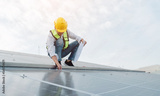Engineers wearing a uniform walking on roof inspect and check solar cell panel, solar cell is smart ecology energy sunlight alternative power factory concept.