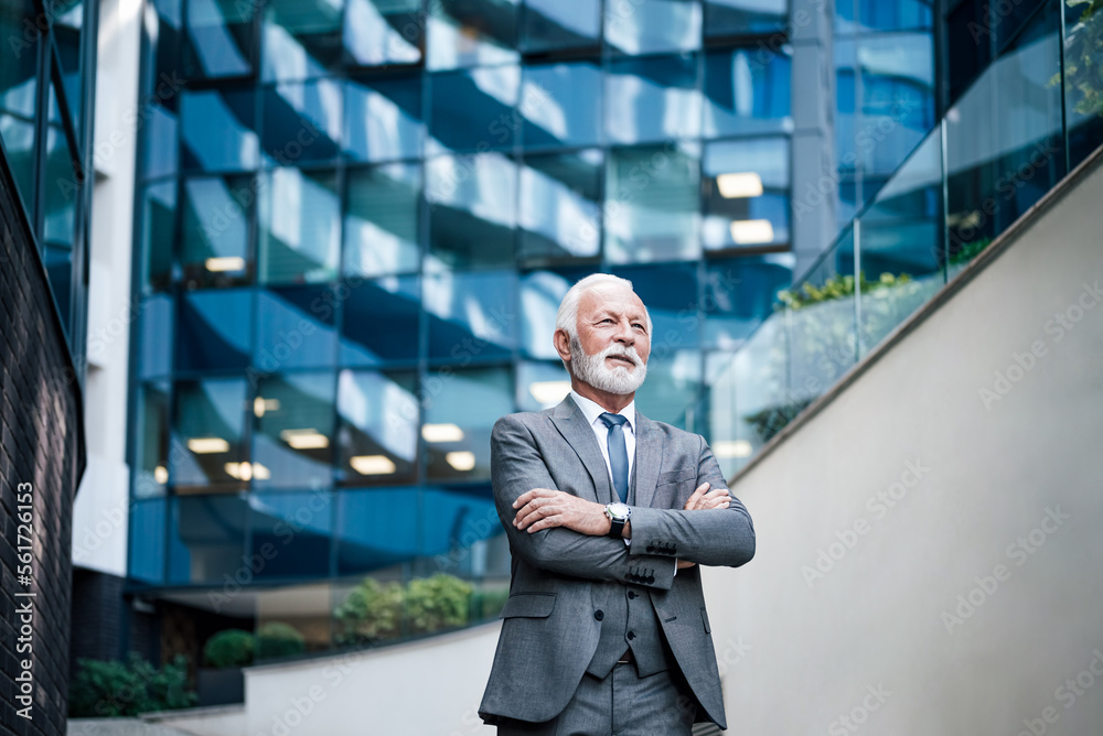 Thoughtful senior male professional looking away with arms crossed. Elderly businessman is standing outside modern office building wearing full business suit.