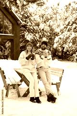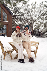 Caucasian woman and man enjoying the winter time in front of house