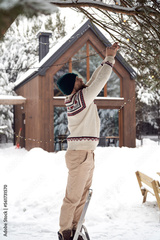 Caucasian man decorating tree by Christmas light in winter season