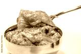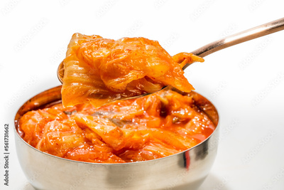 Golden spoon pick up Kimchi Korean pickle seasoning in metal bowl on white background, Spicy Kimchi on white.