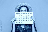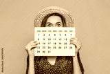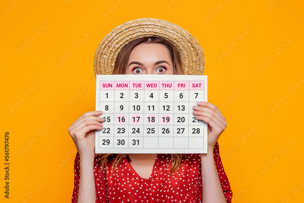 Portrait of a shocked girl in summer hat holding and hiding behind a periods calendar isolated on orange background