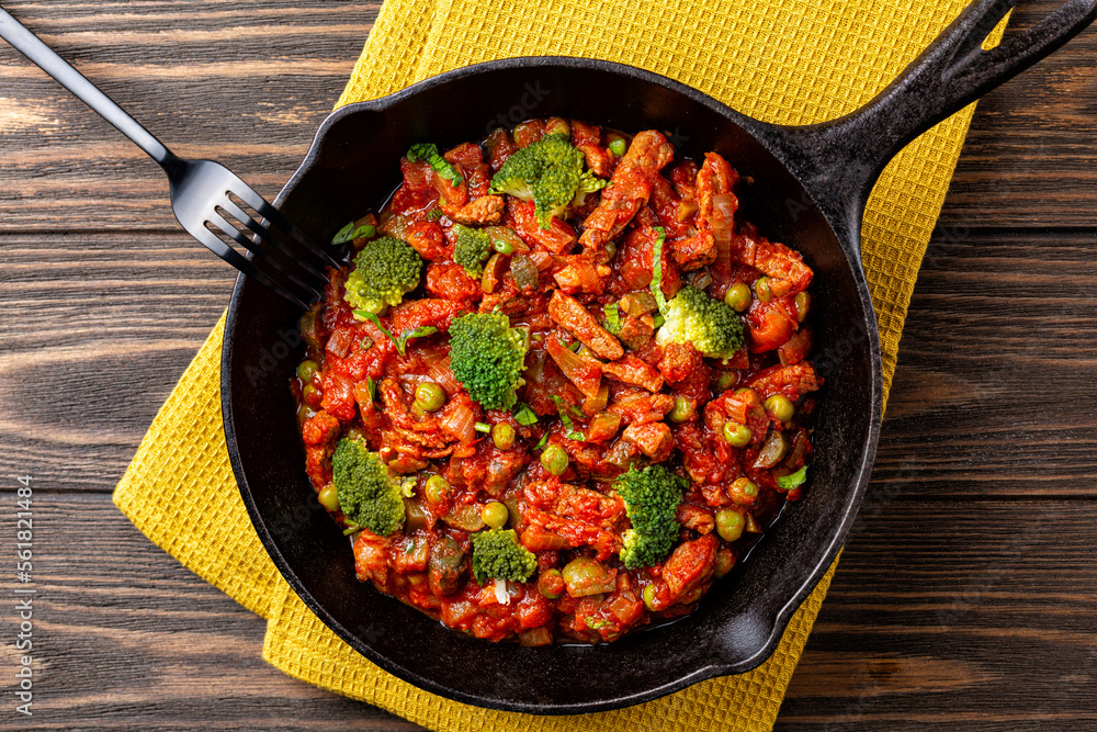 Cast iron skillet with beef and vegetable stew, green peas, broccoli, onion, tomato sauce. Top view, brown table surface.