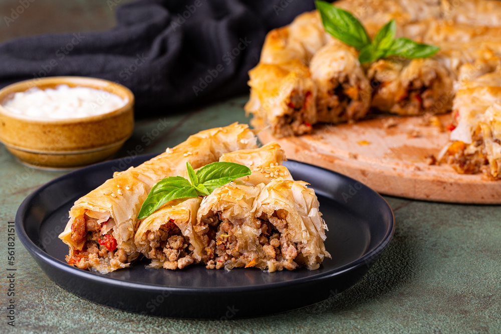 Piece of Rolled Burek - savoury round pie fith meat, onion, tomato, bell pepper feeling, decorated with sesam seedes, yogurt. Dark table surface.