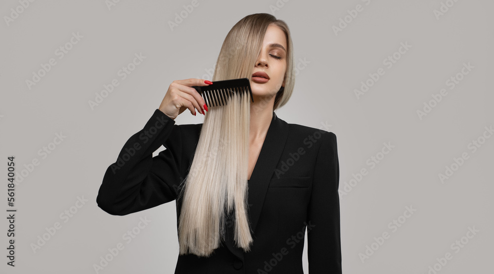 Luxurious blonde combing her long hair. Grey background.