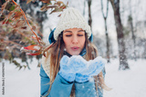 Happy young woman blows snow from hands having fun in winter forest. Girl wearing blue coat and mittens