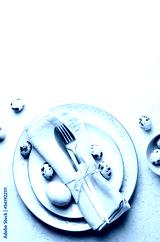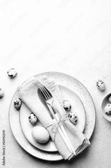 Easter Table Setting with Quail Eggs on Grey Background, Festive Happy Easter Concept