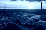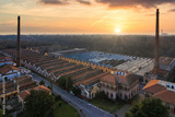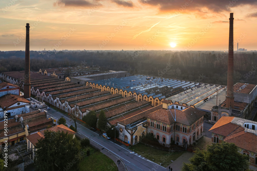 Aerial view of historic worker village of Crespi d'Adda during sunset, Lombardy, Italy