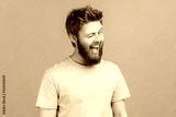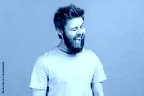 Portrait of bearded man being in good mood, smiling broadly and winking at camera, keeps mouth open, having flirting facial expression. Indoor studio shot isolated on blue background.