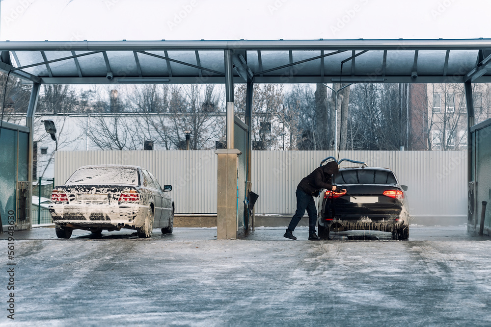 Men driver at car wash with high pressure water equipment pump at self-service outdoor cold snow frosty winter day. Vehicle covered with foam shampoo chemical detergents during carwash self service