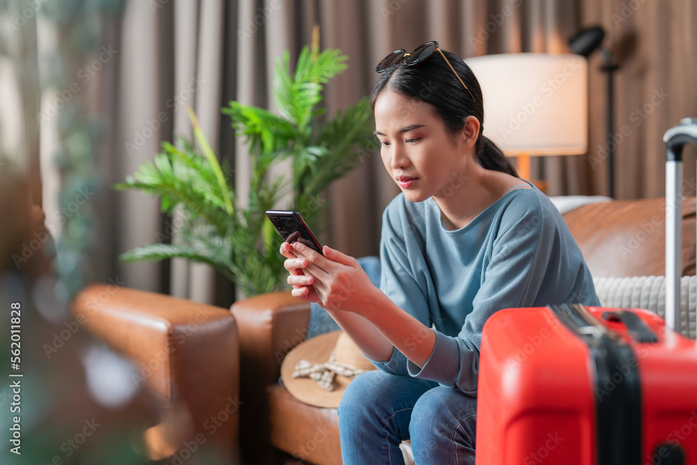 smiling asian female woman traveller hand using smartphone credit card checking booking flight ticket or hotel room reserving online through mobile application before taking abroad trip next vacation