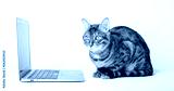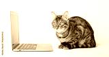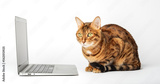 Side view of a ginger bengal cat looking at a laptop screen