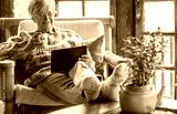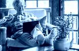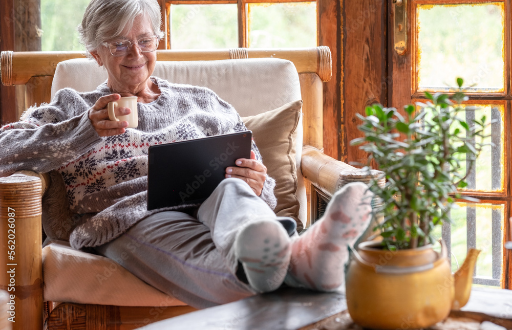 Smiling relaxed pensioner woman sitting at home in an armchair using a digital tablet to see videos or reading a book. Elderly smiling caucasian woman in mountain chalet enjoying tech and social media