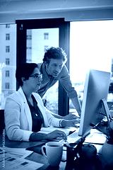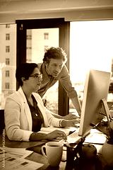 Business, computer collaboration and talking office worker people with web ux data. Work conversation, business people and corporate marketing employee planning a digital strategy with teamwork