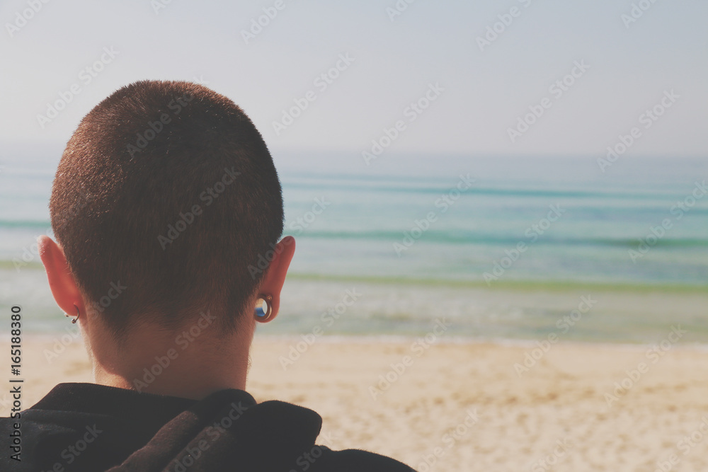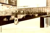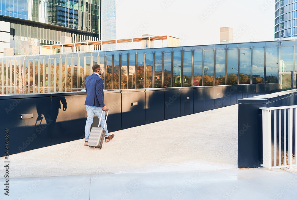 Handsome young black businessman carrying a suitcase walking through the financial district. He is wearing blue jeans and blazer. Business journey concept. Blurred skyscrapers background.