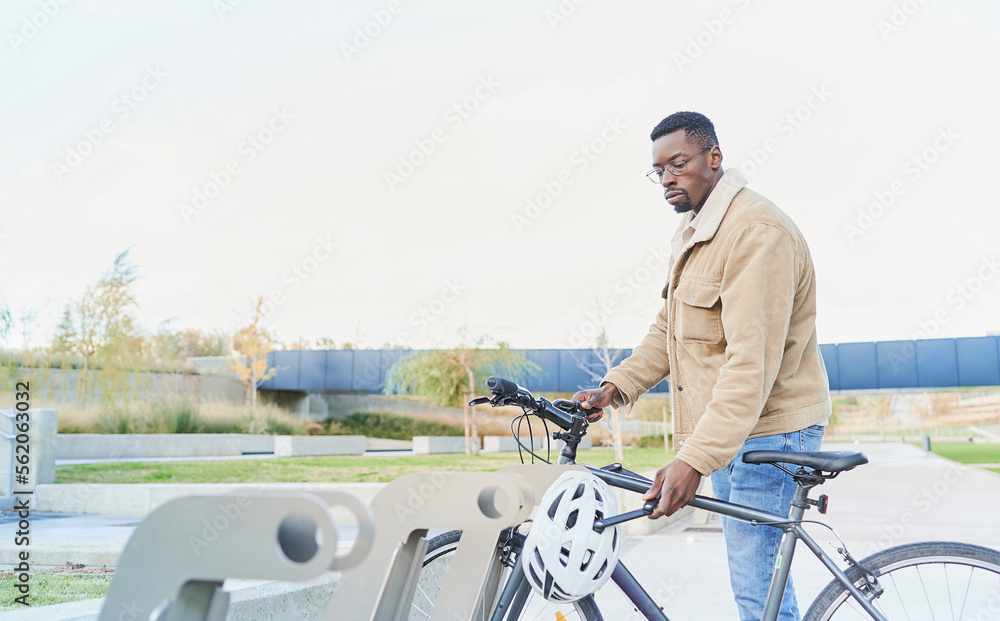 Handsome young black college student parking his bicycle. He is wearing blue jeans and a jacket. Bike as conveyance at the university campus.